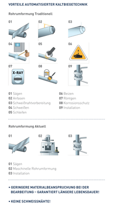 Die traditionelle Rohrumformtechnik sieht einen langwierigen Bearbeitungsprozess mit hoher Materialbeanspruchung vor. Die vielen Schritte vom Sägen über das Anfasen und Schweißen bis zum Beizen, Röntgen und schließlich zur Installation sind nicht nur teuer, sondern hinterlassen auch ihre Spuren auf der Oberfläche des Rohrs.